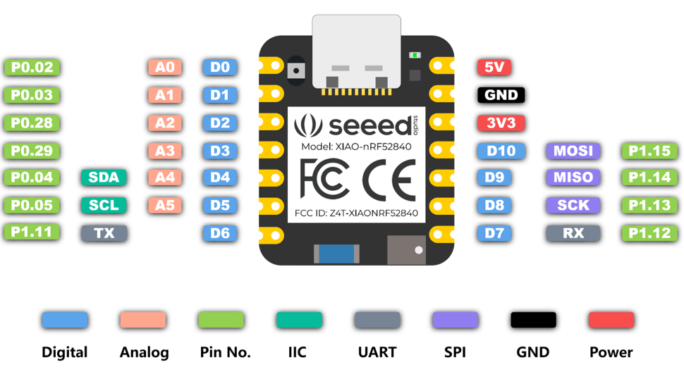 Pins 0..10 are GPIO pins. Pins 0..5 can be analog inputs. This board also has three tiny LEDs: red (pin 11, the user LED), blue (pin 12), and green (pin 13). All LEDs are inverted: set the associated pin LOW to turn the LED on.