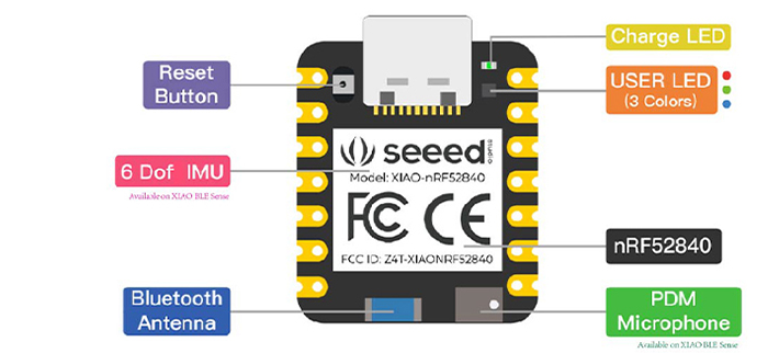 The Sense version also includes an onboard PDM microphone, temperature sensor, and 6-axis LSM6DS3TR-C IMU, which are supported by the MicroBlocks "Microphone", "Basic Sensors", and "Motion" libraries.