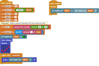 We mentioned in the opening section that the code we have could also graph the bits sent and received. This block set checks the status of the boolean variable stopGraph, and keeps graphing the results of reading the digital GRpin (Pin-2 here; but can be any assigned pin). GRpin is constantly updated by a parallel running block set, that starts when the program is started.